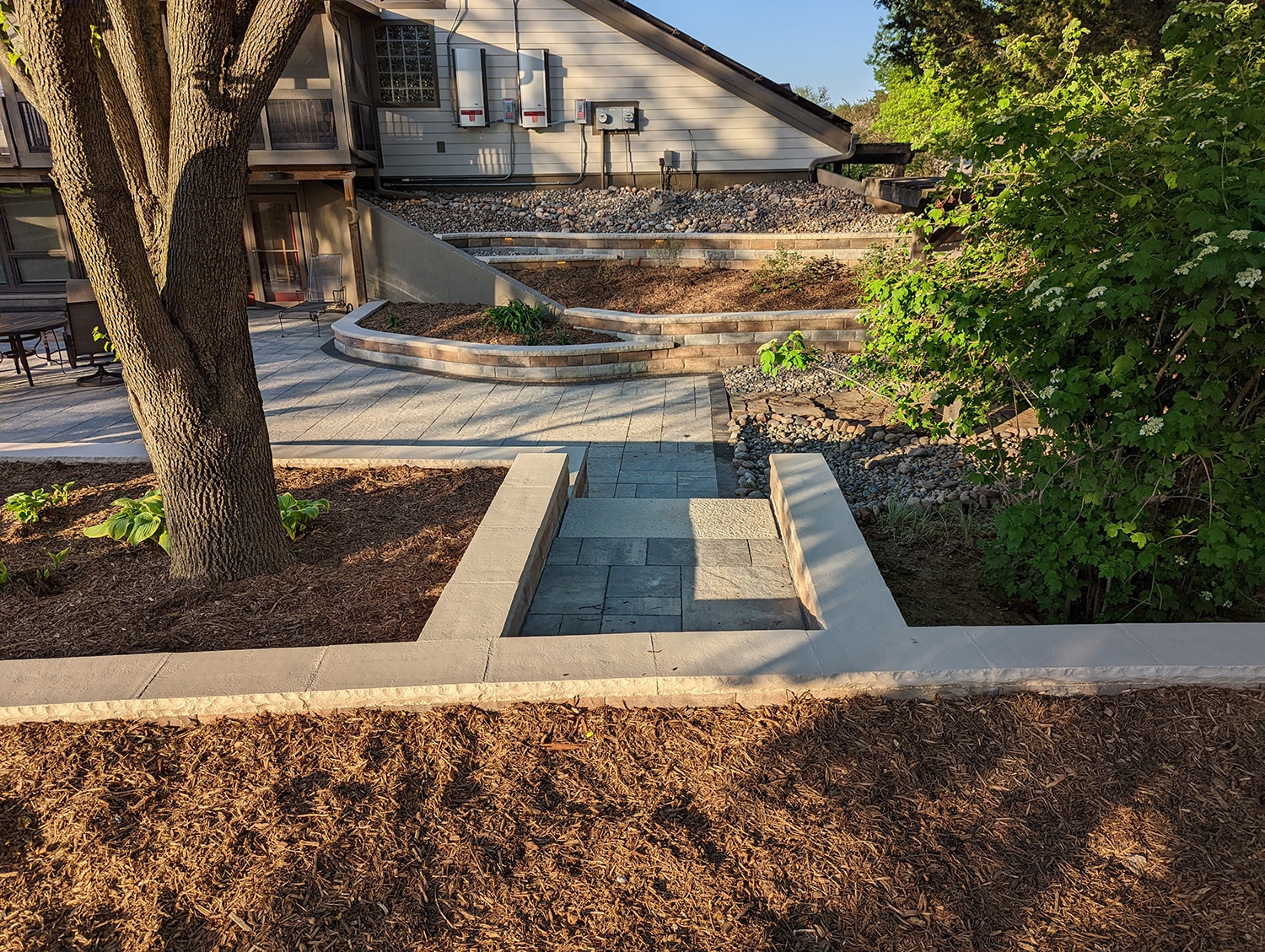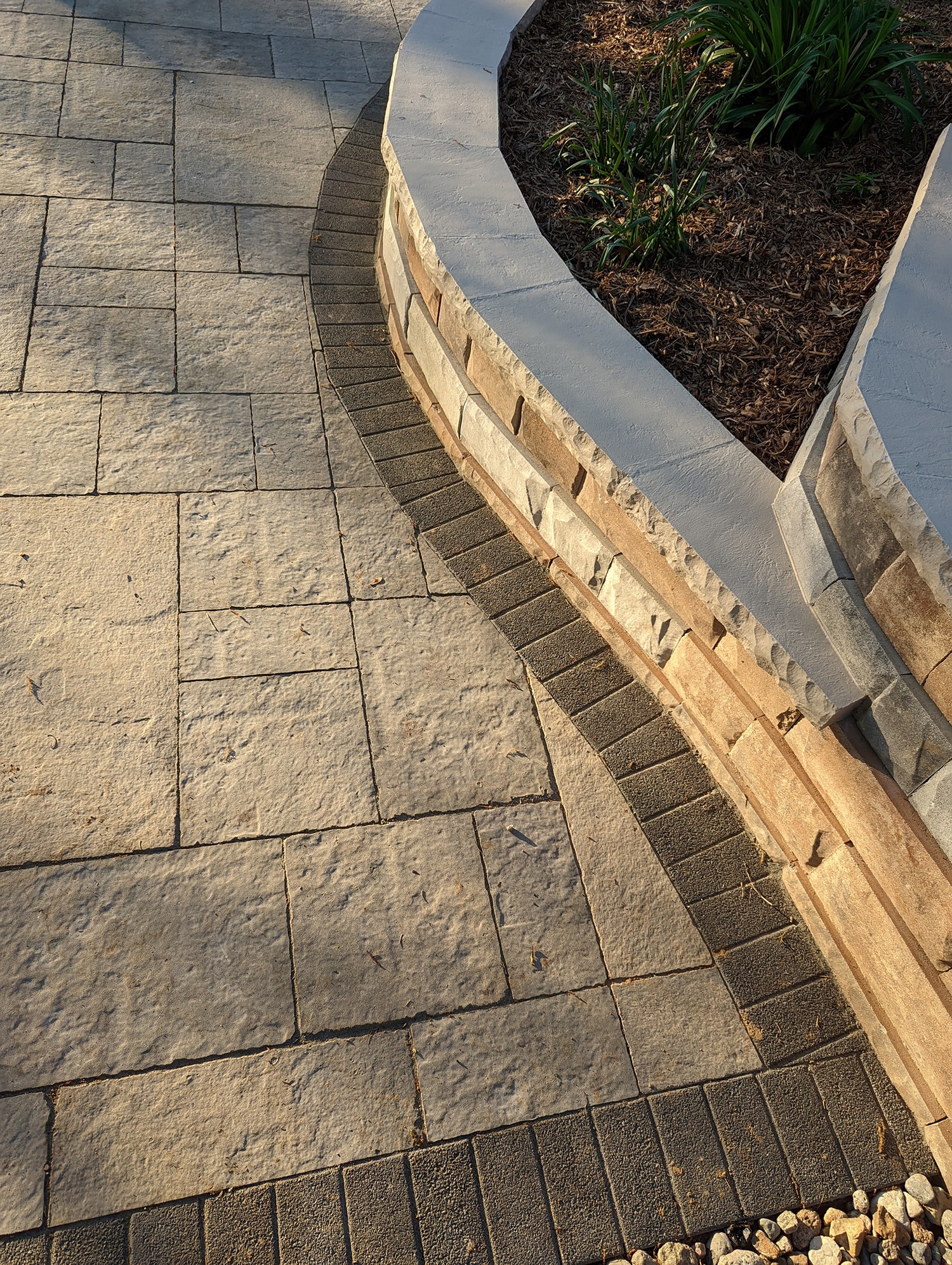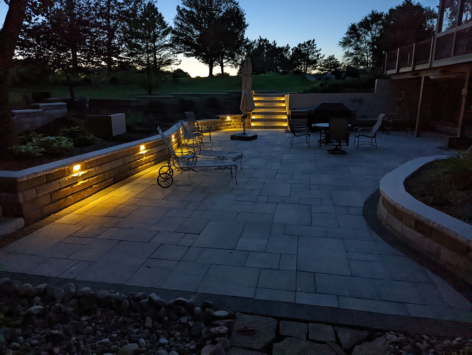 This project was no small job. We replaced over 600 square feet of existing retaining walls and added just over 300 square feet of new retaining wall that encircles the patio space and garden beds. We also added two sets of stone steps and replaced over 1300 square feet of paver patio. The finishing touch was new outdoor lighting that provides the right amount of ambient light to safely enjoy the space at night.