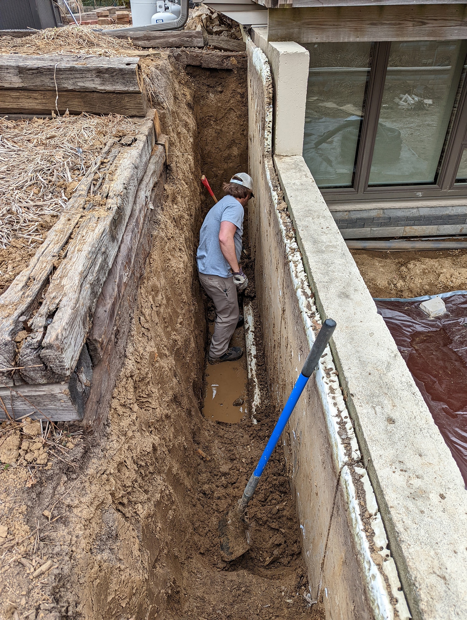 To begin this project, we started with a new outer wall that would prohibit any stormwater flowing onto the patio while also defining the garden bed. We added a bioswale on the uphill side of the wall that directs any stormwater to an existing rain garden.